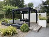 Een pergola is een constructie van balken op hoge palen dat vrijstaand in de tuin geplaatst wordt boven bijvoorbeeld een terras. De pergola Silvano zwart gespoten vuren met zonweringdoek heeft een kwalitatief schaduwdoek dat bescherming biedt tegen de zon. Het antraciet doek is bevestigd met zeilogen en knoppen en heeft een lichtgrijze en een donkergrijze kant. Je kunt zelf bepalen welke zijde je boven en welke zijde je onder plaatst, beide opties zijn mogelijk. De zeilogen en knoppen kun je gemakkelijk losmaken, waardoor het doek s ’winters op te bergen is. Met een pergola creëer je een decoratieve oplossing voor lange zomerdagen in de tuin.